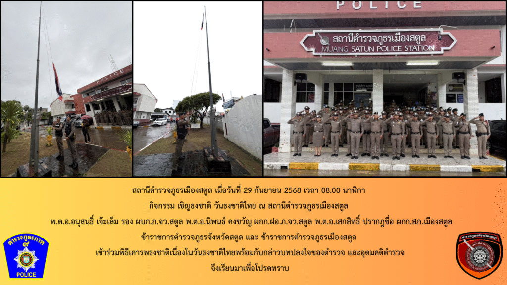 ข้าราชการตำรวจสถานีตำรวจภูธรเมืองสตูล เข้าร่วมพิธีเคารพธงชาติเนื่องในวันธงชาติไทย ณ สถานีตำรวจภูธรเมืองสตูล วันจันทร์ที่ 29 กันยายน 2568