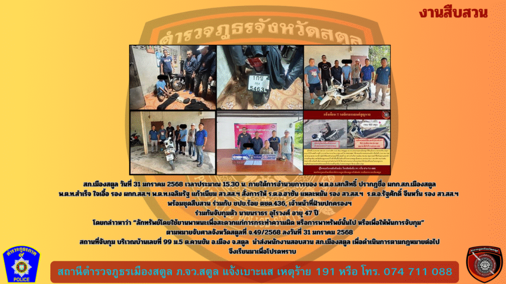 สถานีตำรวจภูธรเมืองสตูล จับกุม ผู้ต้องหา จำนวน 1 ราย เมื่อวันที่ 24 มกราคม 2568 Leave a Comment / สืบสวน ประจำเดือน มกราคม 2568 / By muangsatun