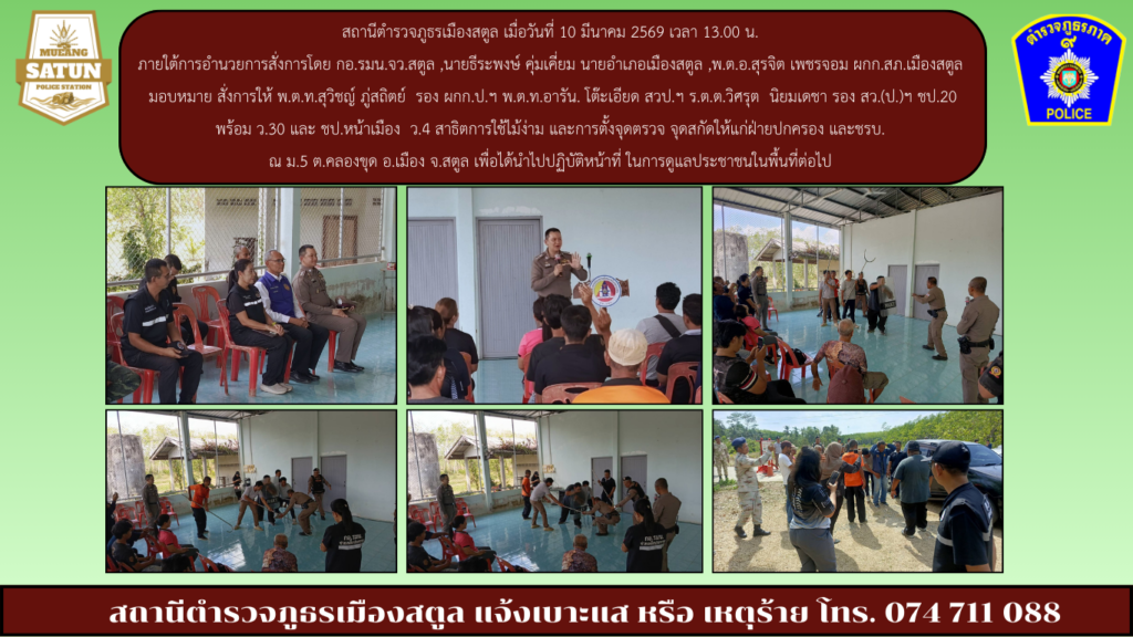 พ.ต.อ.สุรจิต เพชรจอม ผกก.สภ.เมืองสตูล มอบหมาย ชป.20 พร้อม ชป.หน้าเมือง สาธิตการใช้ไม้ง่าม และการตั้งจุดตรวจ จุดสกัด ให้แก่ฝ่ายปกครอง และ ชรบ. ม.5 ต.คลองขุด อ.เมือง จ.สตูล เมื่อวันที่ 10 มีนาคม 2569 Leave a Comment / ข่าวประชาสัมพันธ์ ผลการดำเนินงาน สภ.เมืองสตูล, ปราบปราม ประจำเดือน มีนาคม 2569 / By muangsatun