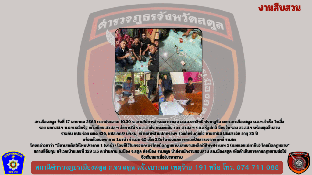 สถานีตำรวจภูธรเมืองสตูล จับกุม ผู้ต้องหา จำนวน 1 ราย เมื่อวันที่ 17 มกราคม 2568 Leave a Comment / สืบสวน ประจำเดือน มกราคม 2568 / By muangsatun