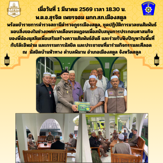 พ.ต.อ.สุรจิต เพชรจอม ผกก.สภ.เมืองสตูล พร้อมข้าราชการตำรวจสถานีตำรวจภูธรเมืองสตูล, ชุดปฏิบัติการมวลชนสัมพันธ์ มอบสิ่งของในช่วงเทศกาลเดือนรอมฎอนเพื่อสนับสนุนการประกอบศาสนกิจ ของพี่น้องมุสลิม ณ มัสยิดบ้านหัวทาง ตำบลพิมาน อำเภอเมืองสตูล จังหวัดสตูล เมื่อวันที่ 1 มีนาคม 2569 Leave a Comment / ข่าวภารกิจผู้บังคับบัญชา / By muangsatun