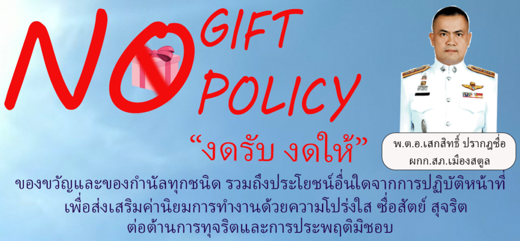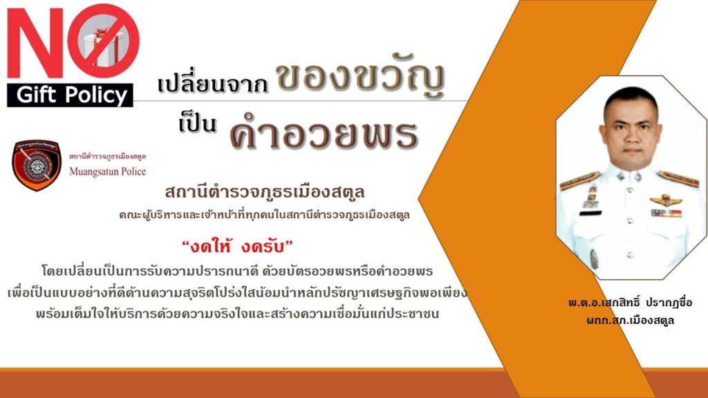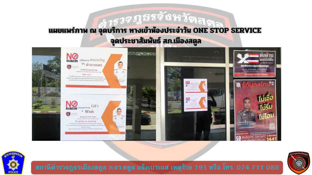 ประกาศเจตนารมณ์ เรื่อง "สุจริต โปร่งใส สถานีตำรวจภูธรเมืองสตูล ใสสะอาด 2567 " และ "งดรับ งดให้" ของขวัญ ของกำนัลทุกชนิดจากการปฏบัติหน้าที่ (NO GIFT POLICY)