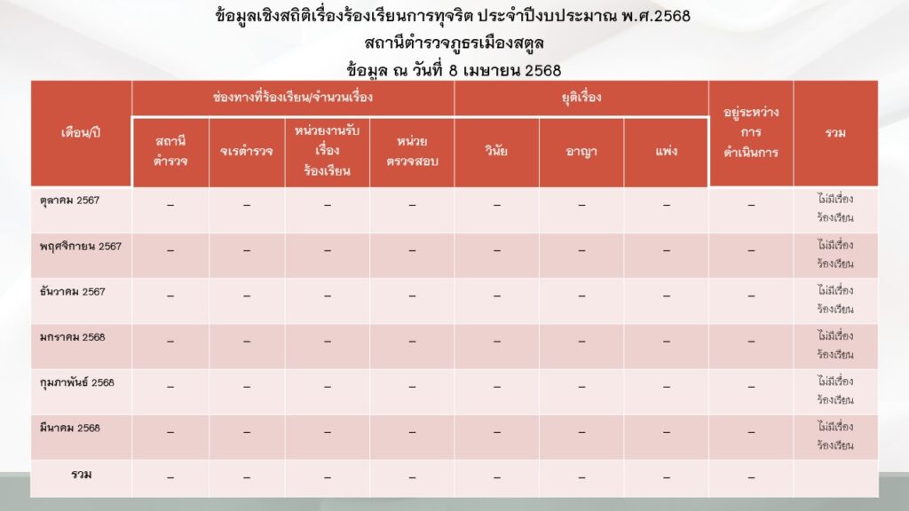 ช่องทางแจ้งเรื่องร้องเรียนการทุจริตของสถานีตำรวจภูธรเมืองสตูล Google forms : https://docs.google.com/forms หนังสือราชการ : สถานีตำรวจภูธรเมืองสตูล งานอำนวยการ เลขที่ 57 ถนนสตูลธานี ตำบลพิมาน อำเภอเมือง จังหวัดสตูล ไปรษณีย์ 91000 โทร. 074711088 จดหมายไปรษณีย์ : satun.police.p9@gmail.com ที่อยู่ : สถานีตำรวจภูธรเมืองสตูลที่อยู่ เลขที่ 57 ถนนสตูลธานี ตำบลพิมาน อำเภอเมือง จังหวัดสตูล 91000 โทรศัพท์/โทรสาร : 074-711088